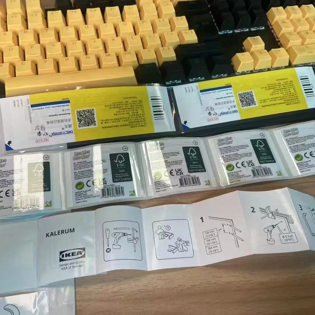 Složené etikety poskytují několikanásobně větší prostor pro tisk své oblasti pokrytí na extrémně omezených površích produktů, jako jsou těla lahví, zkumavky a malá elektronická zařízení. Informace o složených etiketách jsou vrstvené: vnější vrstva jsou souhrnné informace, jako je název produktu a logo, a vnitřní vrstva jsou podrobné informace, jako je seznam složek, návod k použití, čárový kód, vícejazyčný překlad atd.