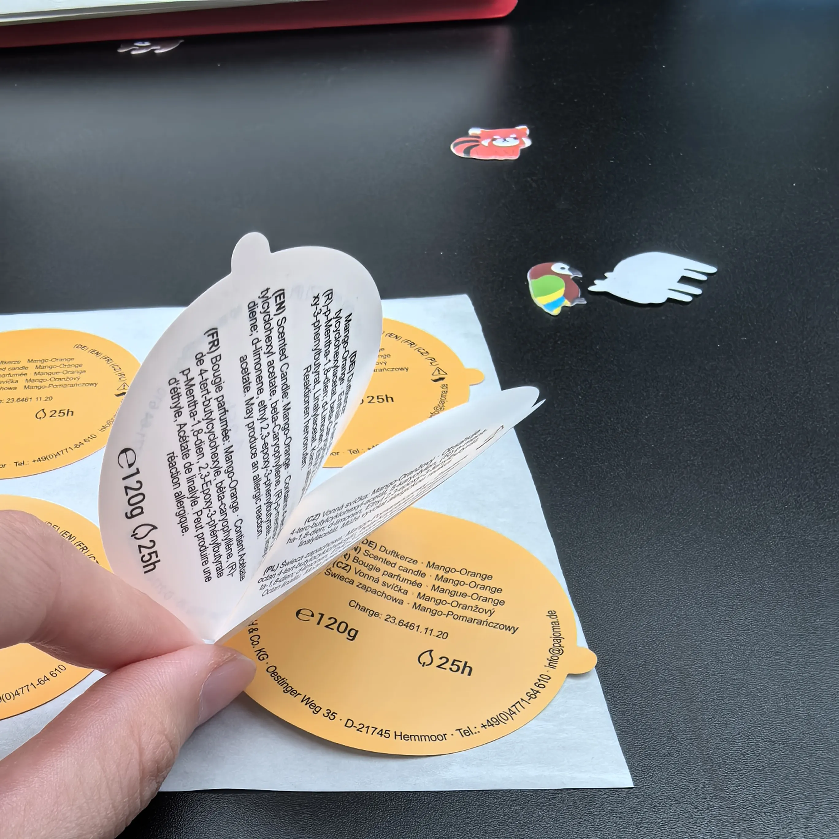 Vícevrstvé etiketyjsou jako "sendvič", skládají se ze 2-3 vrstev samolepek spojených speciálním lepidlem. Každá vrstva je obvykle nezávislá a snadno se odlepuje. První vrstvavícevrstvý štítekje umístěn na povrchu. Když jej uživatel zvedne, uvidí obsah další stránky. Spodní vrstva má samolepící povrch, který lze nalepit na výrobek. Každá vrstva má speciální lepidlo.