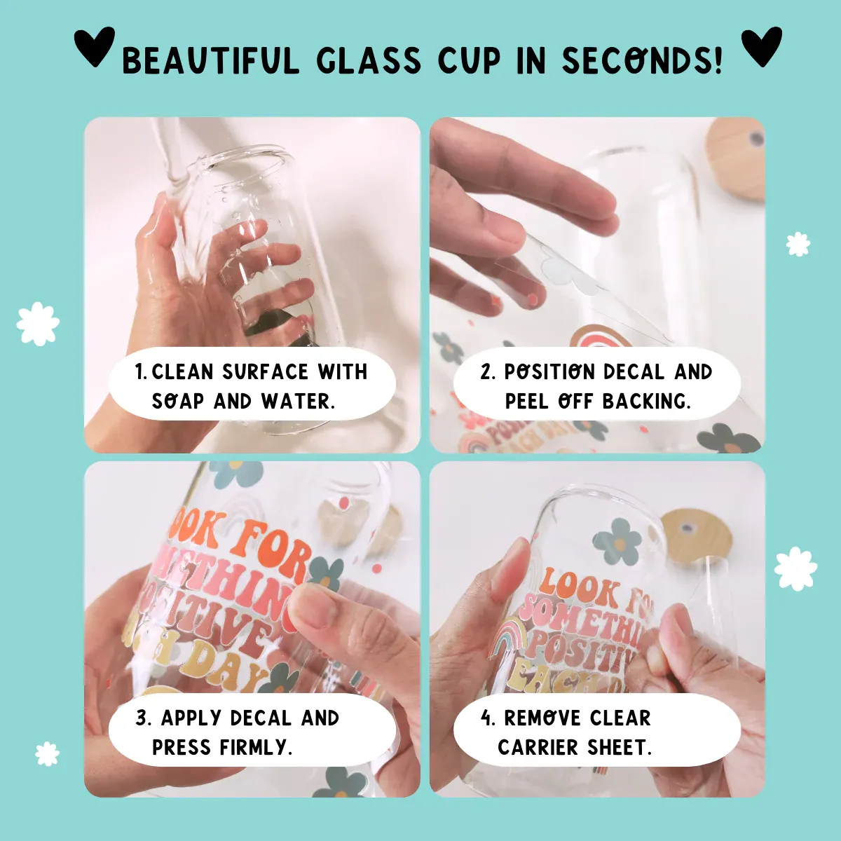 1. Ujistěte se, že je povrch 16oz skleněného pohárku čistý, suchý a bez oleje, jemně jej otřete alkoholovými tampony nebo hadříkem nepouštějícím vlákna, abyste odstranili prach, skvrny od vody nebo mastnotu.