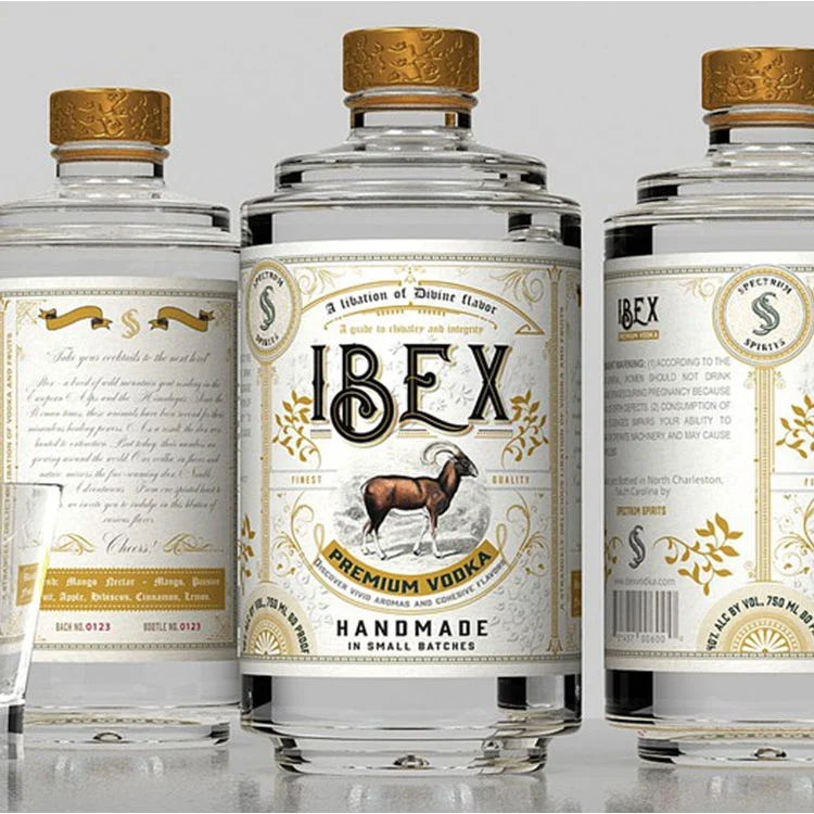 Transparentní štítky:Transparentní štítky vodky umožňují spotřebitelům přímo vidět vzorec a barvu láhve a poskytují vzhled bez štítků.